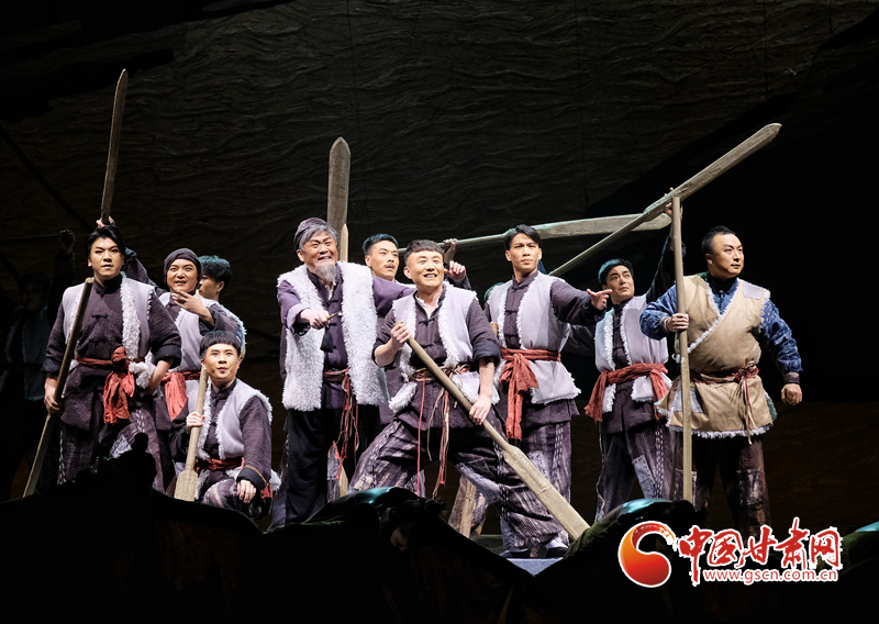 首演當(dāng)晚,一曲黃河特色的“花兒”開場,將觀眾帶回到20世紀30年代末蘭州筏客子在黃河激流中勇敢拼搏的時代。劇中,筏客子們在經(jīng)歷了碼頭爭奪、蘭州遭受日軍轟炸、金城壯烈犧牲等重重考驗后,在國家危難時刻,舍棄個人恩怨,團結(jié)起來支援抗戰(zhàn),組成水上大型運輸隊,將大量物資安全送達抗戰(zhàn)前線。