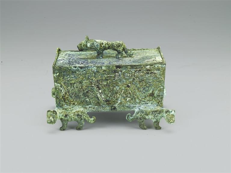 1993年山西省曲沃縣北趙村晉侯墓地62號墓出土。波曲紋虎足方盒為生活用具,出土于晉穆侯夫人墓。盒為長方形,口徑略大于底徑,斜直壁,頂部有立體的虎形捉手,兩扇小蓋可以開啟,盒下有四虎為四足,虎首朝外。盒四壁上部飾鱗紋,下部飾波曲紋。此盒設(shè)計(jì)精巧,器型較小,紋飾精美,應(yīng)是古代貴族女性用來珍藏小型物件的容器。
