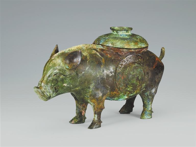山西省曲沃縣北趙村晉侯墓地113號墓出土。豬尊出土于第一代晉侯燮父的夫人墓中。背上有蓋,蓋面飾云雷紋。器腹兩側(cè)各飾同心圓渦紋,周圍飾變形獸面紋。蓋內(nèi)及外底均有銘文:“晉侯乍(作)旅飤(sì)”。“飤”通“食”,多用于青銅食器上,而此尊應(yīng)是盛酒器,在酒器上自銘為飤,較為罕見。豬是伴隨著農(nóng)業(yè)文明的出現(xiàn)而成為最早飼養(yǎng)的動物之一,先秦時期多用作祭祀活動的祭牲。晉侯墓地出土的豬尊,將酒器青銅尊鑄成日常生活中豬的形象,造型逼真,憨態(tài)可掬,工藝精湛,充分體現(xiàn)了青銅工匠的聰明才智。