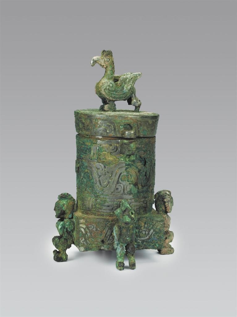 山西省曲沃縣北趙村晉侯墓地63號墓出土。圓筒形,帶蓋,蓋與器體以子母口套合,蓋平頂,上有圓雕立鳥形鈕,鳥彎喙,雙目圓睜,作展翅欲飛狀。器為平口,口沿有一對貫耳,直壁,方形底座,底座四壁各有一個人形足以承器體。人發(fā)髻高聳,赤身裸體,屈膝下蹲,作奮力抬舉器物狀,形象寫實(shí)生動。方座飾波曲紋,內(nèi)底有兩只小鈴,可發(fā)聲。蓋頂飾斜角云紋一周。蓋沿和口沿飾變形獸體紋,筒腹和方座飾波曲紋,筒下層飾鱗紋一周。這種形制的青銅器尚屬首見,其功用還有待于深入研究,但它獨(dú)特的藝術(shù)造型和裝飾卻可以說是集眾器之長,獨(dú)步天下。