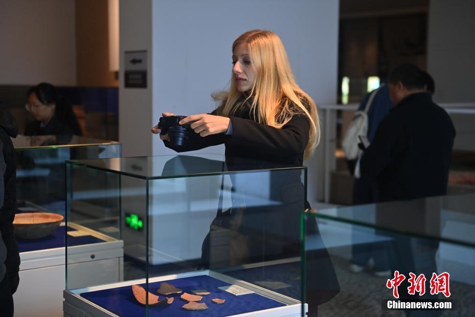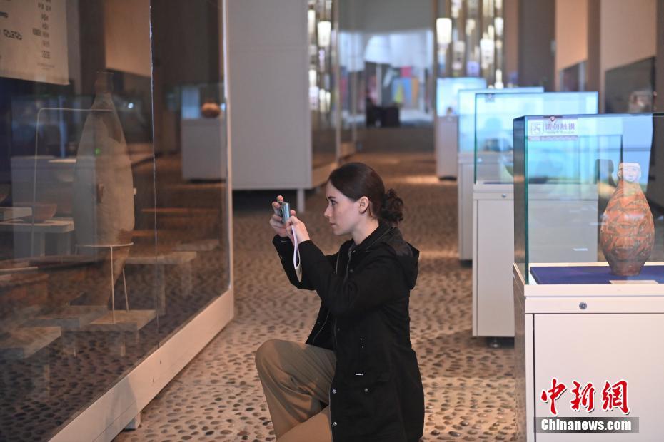 10月22日,2024青年漢學(xué)家研修計(jì)劃甘肅班團(tuán)隊(duì)22個(gè)國(guó)家的青年漢學(xué)家,走進(jìn)甘肅省天水市秦安縣大地灣遺址參觀并進(jìn)行專題研修。大地灣遺址是新石器時(shí)代大型聚落遺址,出土了中國(guó)乃至世界上最早的彩陶文化、最早的文字符號(hào)、種植生產(chǎn)了中國(guó)第一批糧食品種黍、出現(xiàn)了最早的宮殿式建筑、發(fā)明了世界最早的水泥地面、創(chuàng)造了最早的繪畫作品——F411地畫。圖為國(guó)外青年漢學(xué)家拍攝大地灣博物館藏品。中新社記者 李亞龍 攝