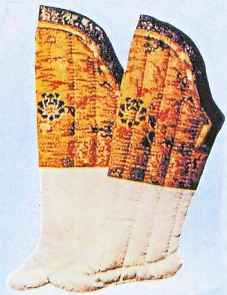 漢代的“夾襪”就是一種棉襪,這種襪子較單層襪厚實(shí),里外兩層,故名。湖南長(zhǎng)沙馬王堆漢墓中曾出土過兩雙夾襪,由雙層素絹縫成,襪面用絹較細(xì),襪里用絹較粗。這是女襪,出土?xí)r放置在棺木邊箱的竹笥之內(nèi),從襪子當(dāng)隨葬品來分析,那時(shí)襪子已是生活中必備衣物。