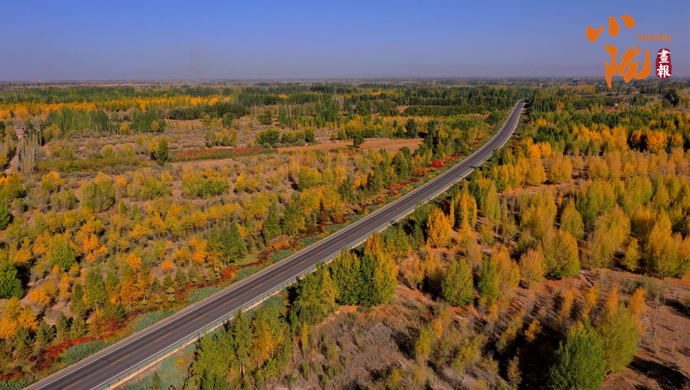 公路沿線成片的五彩林艷麗迷人,與藍(lán)天、荒漠共同勾勒出一幅色彩動人的生態(tài)畫卷。