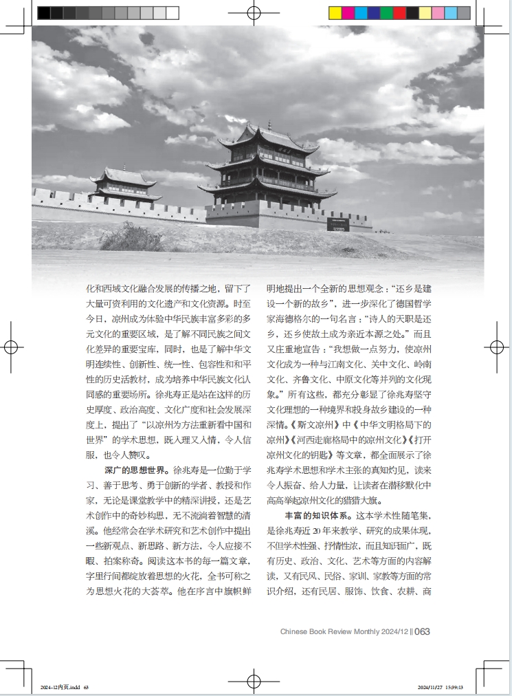 深廣的思想世界。徐兆壽是一位勤于學習、善于思考、勇于創(chuàng)新的學者、教授和作家,無論是課堂教學中的精深講授,還是藝術(shù)創(chuàng)作中的奇妙構(gòu)思,無不流淌著智慧的清溪。他經(jīng)常會在學術(shù)研究和藝術(shù)創(chuàng)作中提出一些新觀點、新思路、新方法,令人應(yīng)接不暇、拍案稱奇。閱讀這本書的每一篇文章,字里行間都綻放著思想的火花,全書可稱之為思想火花的大薈萃。他在序言中旗幟鮮明地提出一個全新的思想觀念 :“還鄉(xiāng)是建設(shè)一個新的故鄉(xiāng)”,進一步深化了德國哲學家海德格爾的一句名言 :“詩人的天職是還鄉(xiāng),還鄉(xiāng)使故土成為親近本源之處。”而且又莊重地宣告 :“我想做一點努力,使涼州文化成為一種與江南文化、關(guān)中文化、嶺南文化、齊魯文化、中原文化等并列的文化現(xiàn)象。”所有這些,都充分彰顯了徐兆壽堅守文化理想的一種境界和投身故鄉(xiāng)建設(shè)的一種深情?!端刮臎鲋荨分小吨腥A文明格局下的涼州》《河西走廊格局中的涼州文化》《打開涼州文化的鑰匙》等文章,都全面展示了徐兆壽學術(shù)思想和學術(shù)主張的真知灼見,讀來令人振奮、給人力量,讓讀者在潛移默化中高高舉起涼州文化的獵獵大旗。