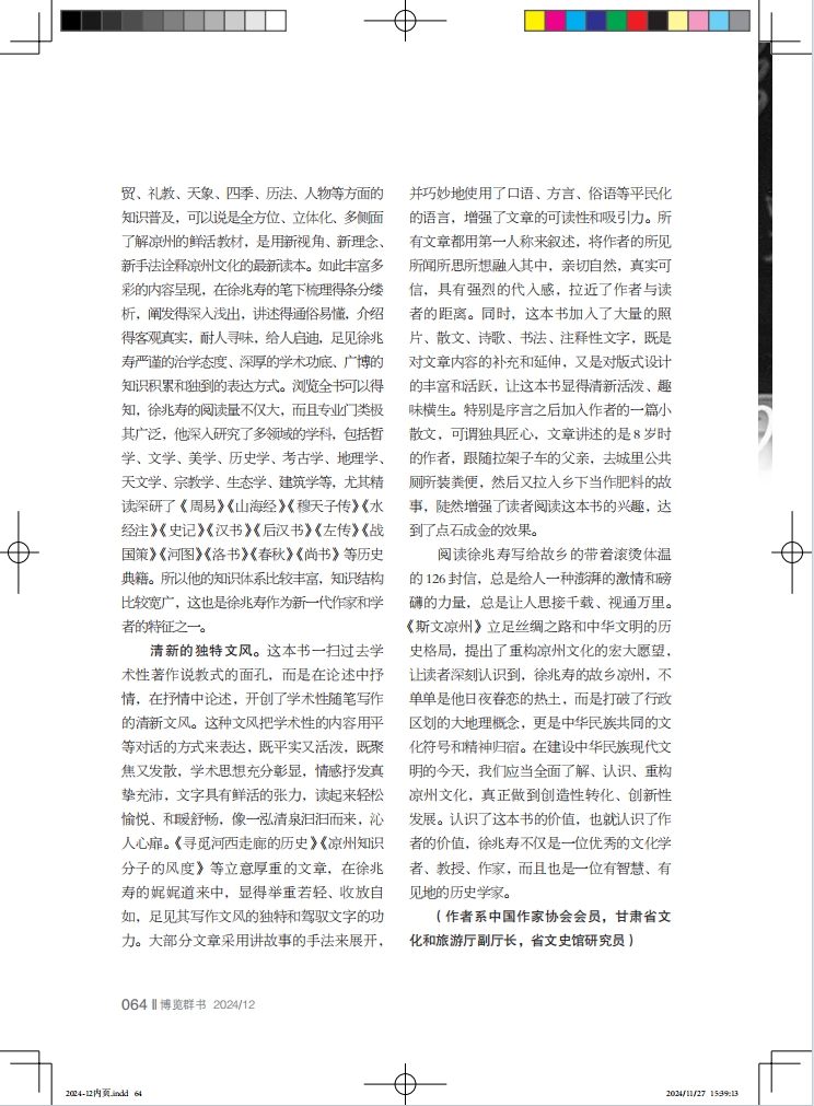豐富的知識體系。這本學術(shù)性隨筆集,是徐兆壽近20年來教學、研究的成果體現(xiàn),不但學術(shù)性強、抒情性濃,而且知識面廣,既有歷史、政治、文化、藝術(shù)等方面的內(nèi)容解讀,又有民風、民俗、家訓、家教等方面的常識介紹,還有民居、服飾、飲食、農(nóng)耕、商貿(mào)、禮教、天象、四季、歷法、人物等方面的知識普及,可以說是全方位、立體化、多側(cè)面了解涼州的鮮活教材,是用新視角、新理念、新手法詮釋涼州文化的最新讀本。如此豐富多彩的內(nèi)容呈現(xiàn),在徐兆壽的筆下梳理得條分縷析,闡發(fā)得深入淺出,講述得通俗易懂,介紹得客觀真實,耐人尋味,給人啟迪,足見徐兆壽嚴謹?shù)闹螌W態(tài)度、深厚的學術(shù)功底、廣博的知識積累和獨到的表達方式。瀏覽全書可以得知,徐兆壽的閱讀量不僅大,而且專業(yè)門類極其廣泛,他深入研究了多領(lǐng)域的學科,包括哲學、文學、美學、歷史學、考古學、地理學、天文學、宗教學、生態(tài)學、建筑學等,尤其精讀深研了《周易》《山海經(jīng)》《穆天子傳》《水經(jīng)注》《史記》《漢書》《后漢書》《左傳》《戰(zhàn)國策》《河圖》《洛書》《春秋》《尚書》等歷史典籍。所以他的知識體系比較豐富,知識結(jié)構(gòu)比較寬廣,這也是徐兆壽作為新一代作家和學者的特征之一。