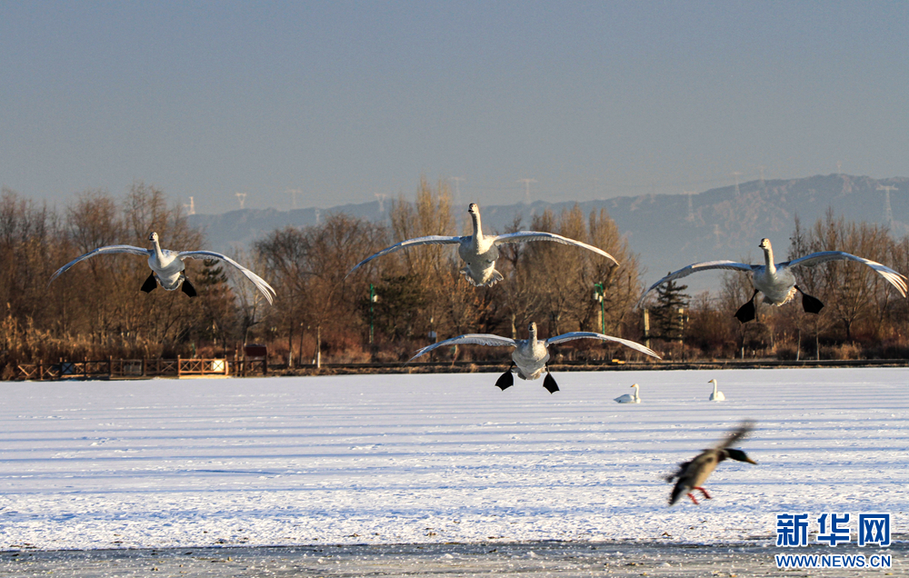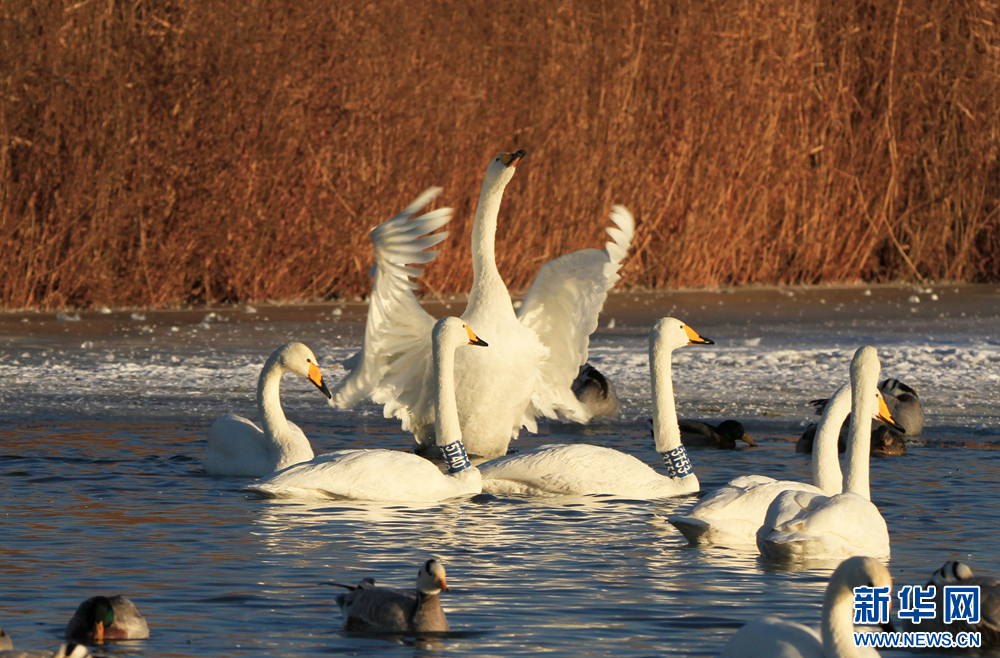 冬日里,在甘肅省張掖國(guó)家濕地公園,數(shù)只白天鵝沐浴著陽(yáng)光悠閑地嬉戲、覓食,呈現(xiàn)出一幅自然和諧的生態(tài)畫(huà)卷。新華網(wǎng)發(fā)(陳禮 攝)