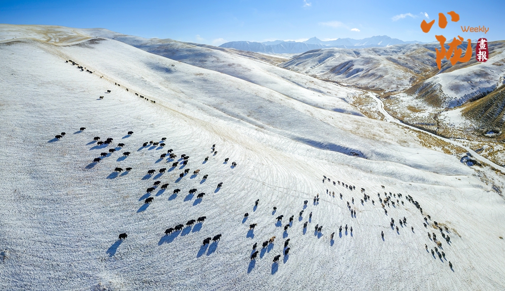 牛群在雪地中悠閑地覓食,和雪景相映成趣,給這片寧靜的草原帶來了生機與活力。