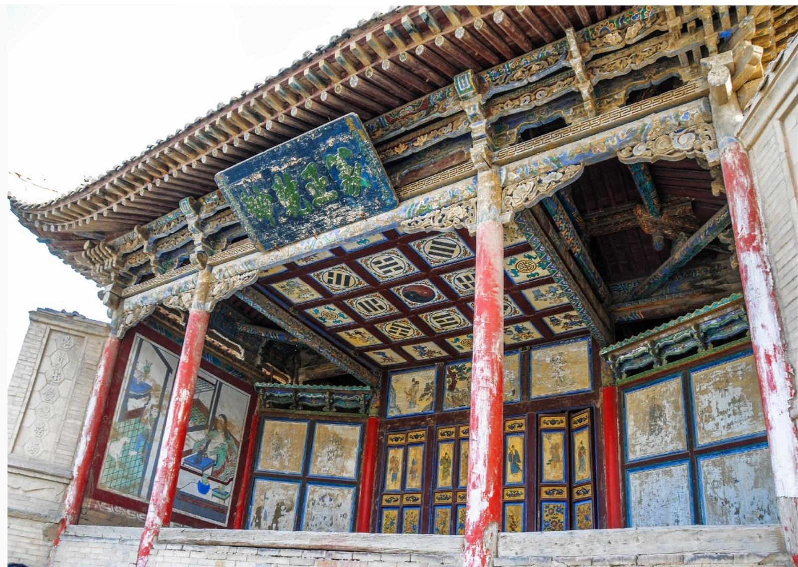 關(guān)帝廟戲樓(現(xiàn)存),關(guān)帝廟又稱武安王廟。明朝中期修建,萬歷六年(公元1578年)奉命鎮(zhèn)守嘉峪關(guān)的酒泉人佘動帶頭重修。乾隆五十七年(公元1792年),游擊將軍袋什衣主持重修,關(guān)帝廟戲樓是當(dāng)時守城官兵、城內(nèi)居民及過往商旅的娛樂場所。戲樓位于朝宗門斜對面,南閘門內(nèi)側(cè),關(guān)帝廟對面。它的形制是典型的中國傳統(tǒng)古典戲臺。關(guān)帝廟戲臺上就有一副意義深遠(yuǎn)的對聯(lián),在兩側(cè)的八字屏風(fēng)磚上刻有:“離合悲歡演往事,愚賢忠佞認(rèn)當(dāng)場。”