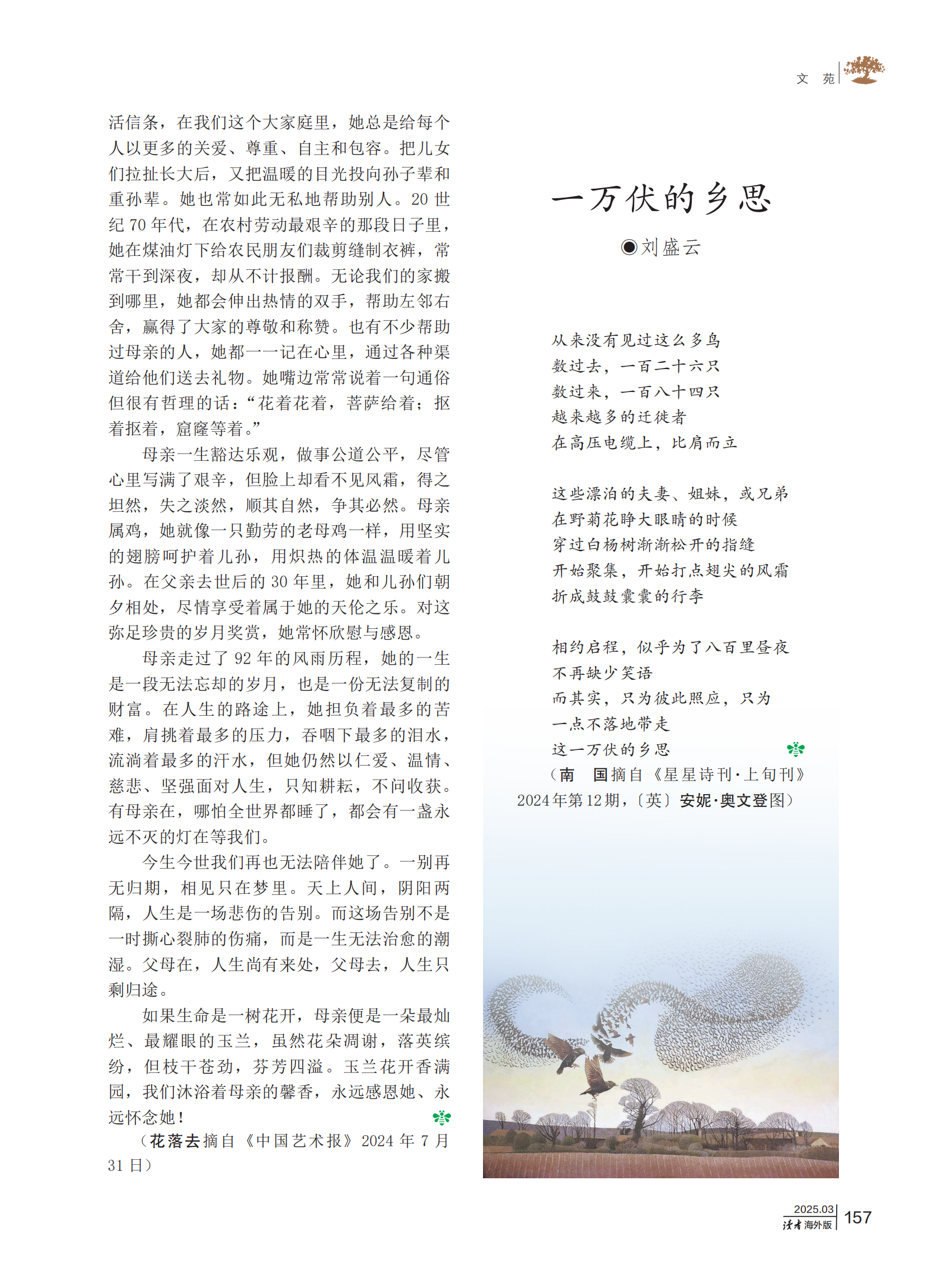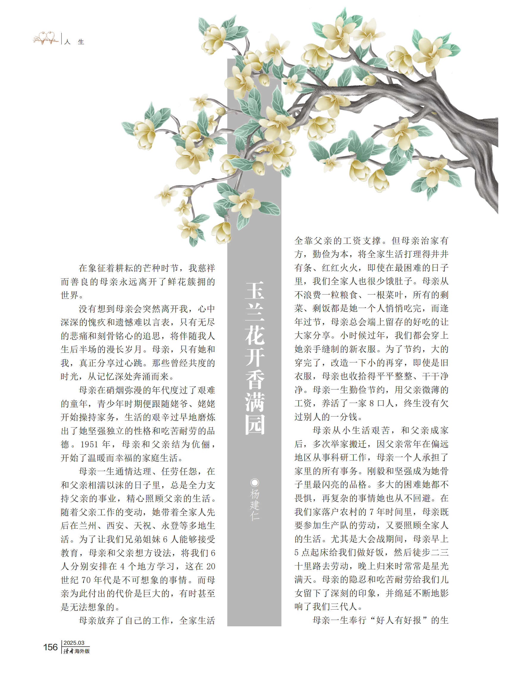 《讀者》(海外版)期刊發(fā)表楊建仁文章《玉蘭花開香滿園》