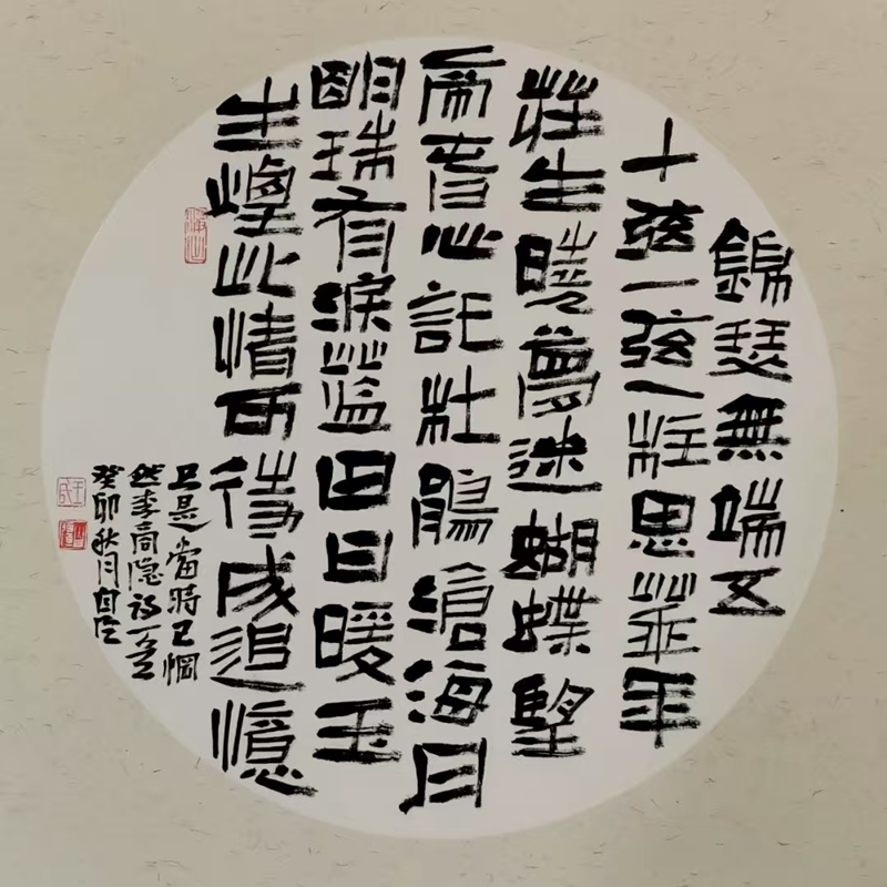 王自強(qiáng)的隸書植根于《西狹頌》的金石氣,又融入個(gè)人創(chuàng)新。他的作品《李白古風(fēng)其一》在2021年“中國(guó)書法·年展”中脫穎而出,以古樸厚重的筆法、靈動(dòng)多變的章法,位列全國(guó)前51名,成為成縣首位躋身國(guó)家級(jí)書法大展的藝術(shù)家。2025年,他的隸書作品再次入選全國(guó)第五屆隸書作品展,在15214件投稿中脫穎而出,展現(xiàn)出對(duì)漢隸藝術(shù)的深刻理解與創(chuàng)新表達(dá)。