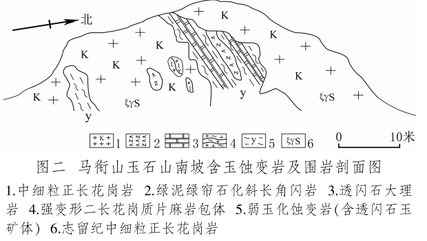 馬銜山玉礦分布在馬銜山東南部的玉石山(圖版一),海拔3028米。山上出露的地質(zhì)體主要為古元古界馬銜山巖群、中元古代片麻二長花崗質(zhì)巖[3]和志留紀(jì)正長花崗巖及正長巖。馬銜山巖群的巖性為黑云斜長片麻巖、變粒巖、斜長角閃巖和白云質(zhì)大理巖,巖石普遍遭受了韌性變形,變余糜稜巖發(fā)育。志留紀(jì)巖漿侵入期后熱液活動較強,石英脈細脈發(fā)育,局部見螢石礦化或礦床[4]。玉礦化主要產(chǎn)于馬銜山巖群與志留紀(jì)正長花崗巖和正長巖接觸帶上(圖版二),具體賦存在與白云質(zhì)大理巖的接觸部位,是正長花崗巖及正長巖與鎂質(zhì)大理巖接觸交代蝕變的產(chǎn)物[5]。花崗巖與片麻巖、變粒巖和斜長角閃巖接觸界線附近巖石雖有蝕變,但不見玉化蝕變巖或玉石出露。在近山頂開采玉石揭露的一個地質(zhì)剖面清晰地顯示了這些特征(圖二)。該剖面大致呈東西走向,長約50米,馬銜山巖群多呈殘留體出露,斜長角閃巖綠泥綠簾石化強烈,大理巖普遍發(fā)生蝕變,形成透輝透閃石大理巖,緊靠花崗巖接觸地帶發(fā)育窄窄的透閃石玉礦帶?,F(xiàn)在人們找玉,也主要在該剖面上的花崗巖和鎂質(zhì)大理巖的接觸帶上鑿洞,在接觸帶上見有多處采挖玉石的洞穴。在該剖面西側(cè)約50米,發(fā)育有正長巖與大理巖的混染帶,肉紅色正長巖中包裹混染著大量灰綠色透閃透輝大理巖,部分已蝕變?yōu)橥搁W透輝石巖,且質(zhì)地較細膩,成為半玉化巖石。剖面和周圍地質(zhì)特征表明,玉礦的形成是早古生代志留紀(jì)花崗質(zhì)雜巖體侵入到古元古代鎂質(zhì)大理巖,發(fā)生接觸交代蝕變作用的結(jié)果,在兩種巖石接觸帶形成玉礦體。但并不是蝕變帶中的巖石都是透閃石玉石,透閃石玉在蝕變帶中多呈雞窩狀或不規(guī)則狀分布,少量呈脈狀出露。從剖面及部分采坑的規(guī)模來看,玉礦體向深處有變大、變好的趨勢,這主要受控于接觸面產(chǎn)狀,在傾角較緩處礦體相對較大。橫向上在背離接觸面方向圍巖具有從透閃石玉到透閃透輝石玉、透閃透輝石大理巖再到含透閃石大理巖的變化特征,反映了交代蝕變強度與接觸帶溫度及熱液成分變化的密切關(guān)系。從玉礦體到蝕變圍巖由于成分和結(jié)構(gòu)的變化出現(xiàn)一系列不同類型的玉石或巖石。我們在剖面上采集到一些小塊的淡綠色玉料(圖版三)和出露較寬的微晶大理巖,經(jīng)偏光顯微鏡下薄片鑒定和XRF檢測,確定有透閃石玉、透輝透閃玉、透閃透輝石玉、透閃透輝石大理巖和含透閃石大理巖等,這與馬家窯遺址出土的齊家文化時期大部分玉質(zhì)品玉料類型基本一致[6]。部分地段近礦圍巖還有透輝石巖、透輝矽卡巖、矽卡巖化大理巖、蛇紋石化大理巖、斜長透輝石巖等。玉石山的采洞(坑)由于資源與環(huán)境保護的要求,大多已被填埋,但仍可見采坑殘留的位置。采洞(坑)均位于大理巖與正長花崗巖接觸帶靠近大理巖一側(cè),這也間接顯示了玉礦體的位置。此外,玉石山花崗巖中石英細脈較發(fā)育,局部可見螢石礦化,反映了花崗巖侵入期后低溫?zé)嵋夯顒尤暂^強,對玉礦也有一定的改造影響。