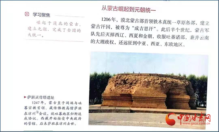 在高一歷史課本第56頁中外歷史綱要(上)第三單元有一段記錄“涼州會談”的簡要文字:“1247年,蒙古皇子闊端與吐蕃宗教首領(lǐng)、藏傳佛教高僧薩班在涼州會談,就吐蕃地區(qū)歸附達成協(xié)議。西藏開始接受中央政府的管轄。后來薩班在涼州去世。”文字右上角是一張薩班靈骨塔遺址配圖。
