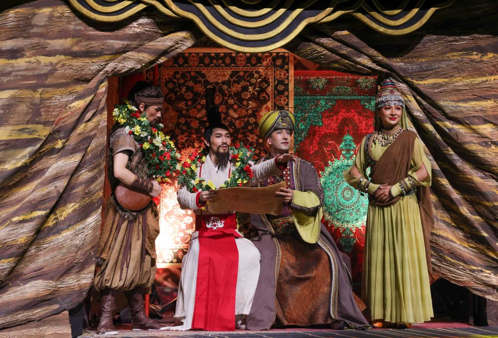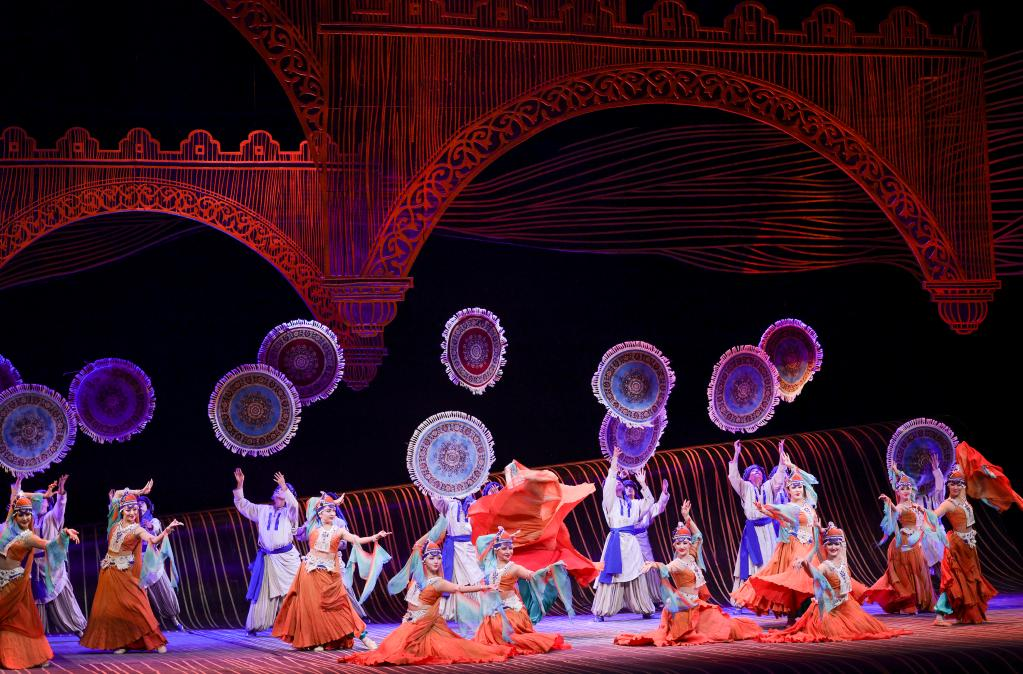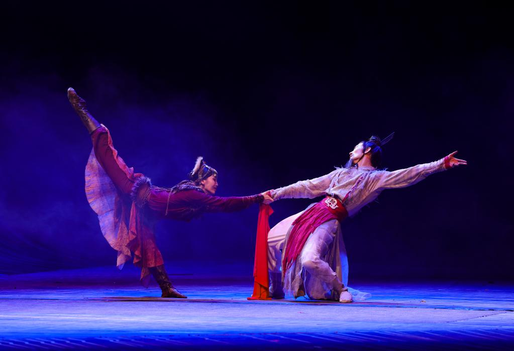 10月27日晚,在烏魯木齊文化中心大劇院,演員在舞劇《張騫》中表演。 10月27日晚,以漢代張騫出使西域?yàn)樗{(lán)本創(chuàng)作的重大歷史題材舞劇《張騫》,在烏魯木齊文化中心大劇院首演。該劇由《授節(jié)》《守節(jié)》《傳節(jié)》《使節(jié)》四幕組成,演繹了張騫出使西域的“鑿空之旅”,展現(xiàn)了各民族廣泛交往、全面交流、深度交融的生動場景。 新華社記者 王菲 攝