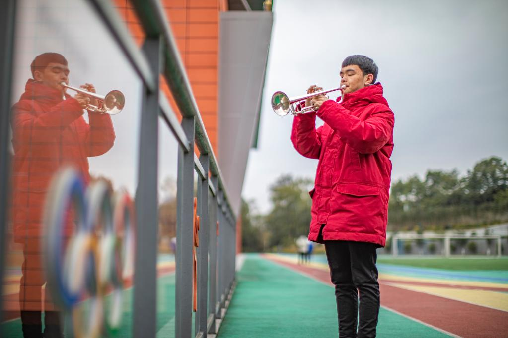 手指在樂章上摸索學習,手指也在小號的按鍵上上下飛舞。展現出音樂天賦的王太樊,幾乎把課余時間都花在了音樂上。他說,每次吹起小號,他都覺得有一束光從頭頂上照下來,照亮他腳下的路,也照亮他的內心世界。“音樂讓我明白,失明沒什么可怕的。只要心是雪亮的,世界就會對你微笑。”
