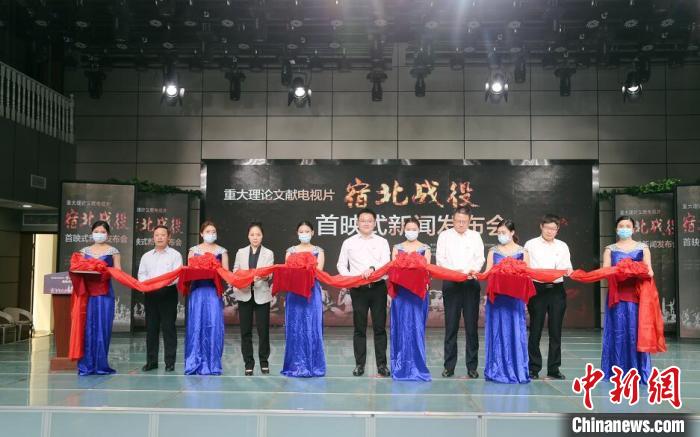江蘇省宿遷市宿豫區(qū)電視臺分會場進(jìn)行《宿北戰(zhàn)役》首映剪彩儀式?!⒘帧z