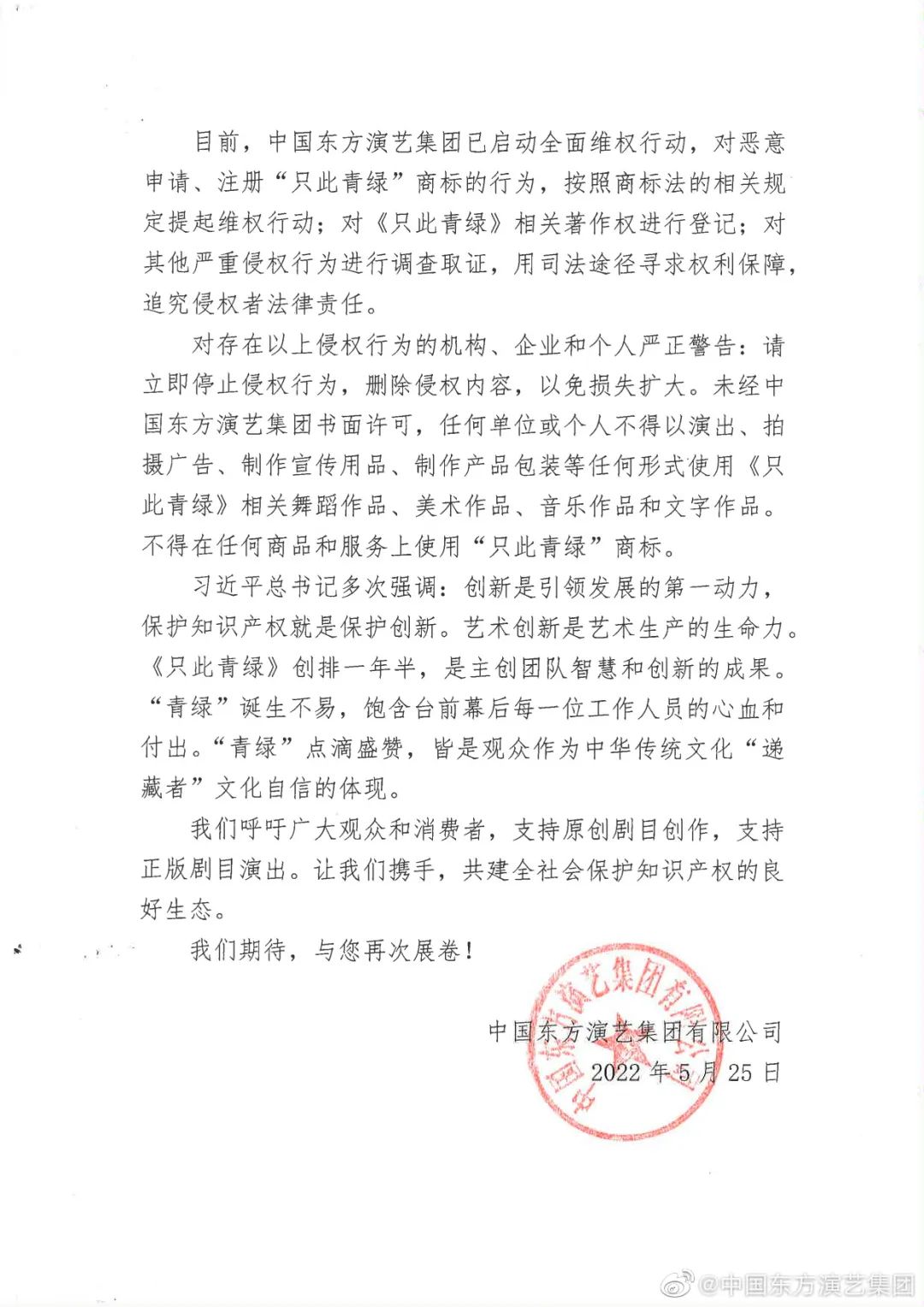 作為舞蹈詩(shī)劇《只此青綠》出品方之一,中國(guó)東方演藝集團(tuán)25日發(fā)表聲明,已啟動(dòng)對(duì)《只此青綠》的全面維權(quán)行動(dòng)。