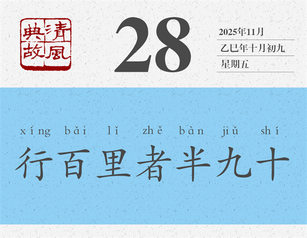 后人即以“行百里者半九十”為典,比喻做事情越到最后越困難,越接近成功越要認(rèn)真對待。黃庭堅(jiān)雜言詩《贈元發(fā)弟放言》:“虧功一簣,未成丘山。鑿井九階,不次水澤。行百里者半九十,小狐汔(qì)濟(jì)濡其尾。故曰時(shí)乎,時(shí)不再來。終終始始,是謂君子。”全詩幾乎都在闡釋“行百里者半九十”。其中還用了《周易》中的一個(gè)比喻:小狐貍過河時(shí),幾乎就要過去了,但因?yàn)槠疵鼟暝?,還是弄濕了尾巴。