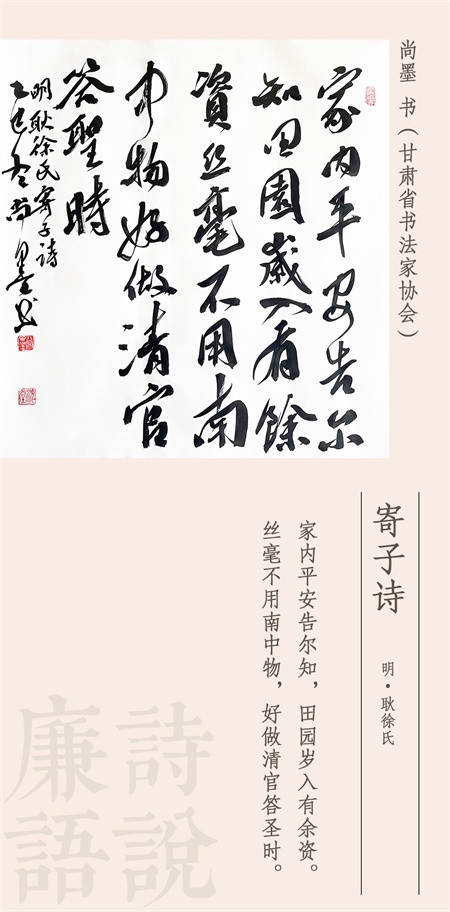 耿庭柏少年得志,20歲即中進(jìn)士、任知縣,可謂春風(fēng)得意。但耿徐氏卻并沒有一味沉溺于兒子帶來的榮耀,而是很冷靜、及時地寫了這首詩寄給他,給予諄諄告誡。詩句很平實,意思很明確,家中一切都好,田園的收入完全能夠養(yǎng)活家人。所以山陰(即今紹興)這個富庶之地的一絲一毫你都不可非法攫取來寄給我,只要你好好地做個清官來報答國家和黎民就足夠了。這首詩當(dāng)時即傳誦一時,后來還被收入清代沈德潛編纂的《明詩別裁集》、宋弼編纂的《山左明詩鈔》等詩歌選集中。耿家為書香門第,科甲鼎盛,先后出過七個進(jìn)士,但他們的詩詞作品都沒有流傳下來,反而是耿徐氏的這首詩為家族撐了門面。