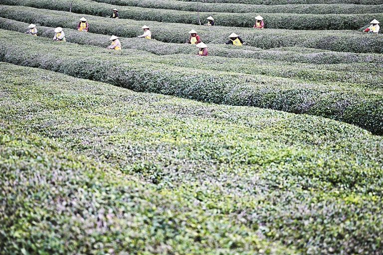 圖②:福鼎白茶文化系統(tǒng)位于福建省福鼎市,其獨特的地理位置、氣候條件和悠久歷史孕育了特有的茶樹品種和制茶技藝,以及深厚的文化內(nèi)涵。圖為福鼎市一家茶企工人在茶園采茶。(資料圖片)