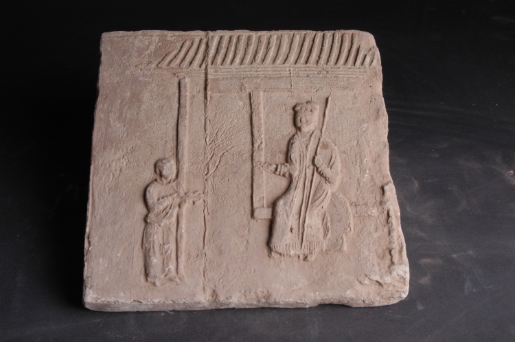宋代。縱30.2厘米,橫30.7厘米,厚3厘米。征集。磚呈長方形,青灰色,通過模印工藝展示了屋檐下一婦人坐于窗臺前,給一端物的幼子訓(xùn)話的場景,是研究宋代社會生活、家庭倫理及畫像磚藝術(shù)的珍貴實物資料。