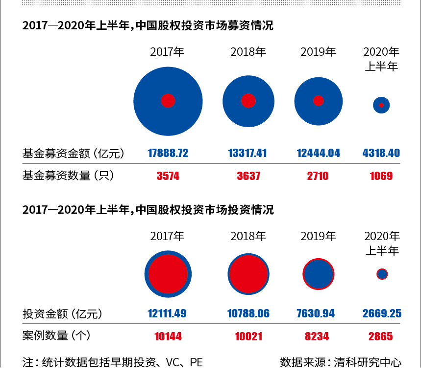 從清科研究中心公布的數(shù)據(jù),亦可窺見2020年上半年募資難與投資緊的全貌。該研究中心數(shù)據(jù)顯示,2020年上半年市場(chǎng)共有1069只基金完成新一輪募集,金額總計(jì)4318.40億元人民幣,同比下降29.5%;市場(chǎng)共發(fā)生2865起投資事件,涉及金額2669.25億元,同比分別下滑32.7%、21.5%。
