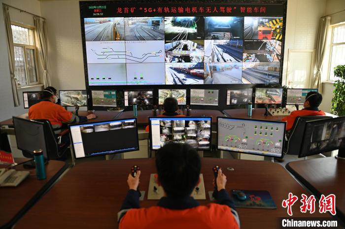 圖為金川集團(tuán)龍首礦“5G+有軌運(yùn)輸電機(jī)車無人駕駛”智能車間內(nèi),操作員正在進(jìn)行遠(yuǎn)程控制?!?/p>