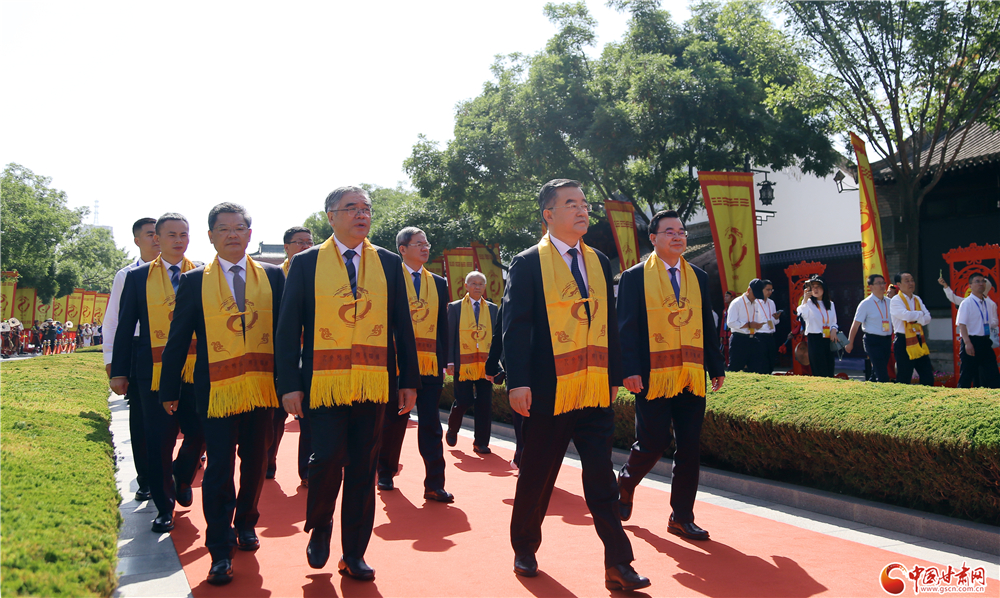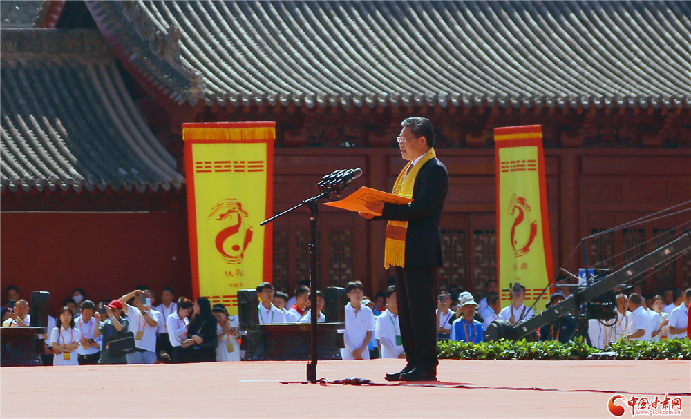 隴山蒼蒼,渭水泱泱。羲皇勛德,日月齊光。福佑中華,龍脈永昌。爰成斯禮,敬奠瓊漿。公祭儀式上,中共甘肅省委副書(shū)記、省長(zhǎng)任振鶴恭讀祭文,所有來(lái)賓面向伏羲廟方向三鞠躬敬祭。
