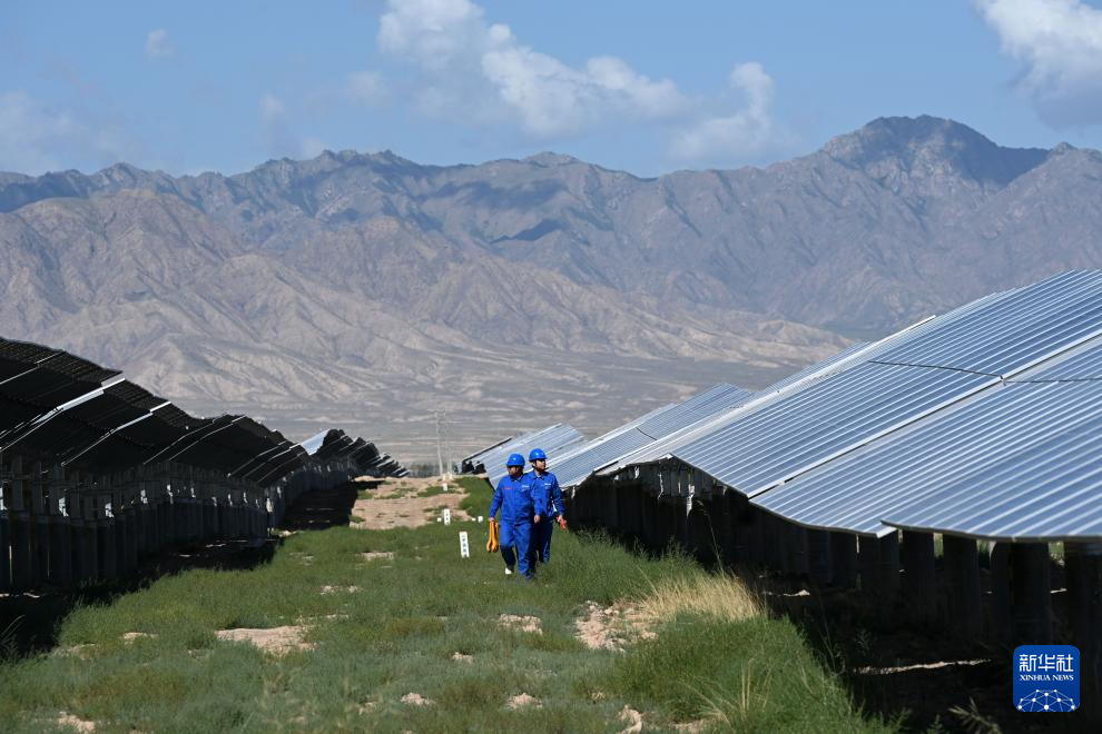 8月11日,工作人員在中國能建張掖甘州南灘30萬千瓦光伏發(fā)電項目巡檢。新華社記者 金良快 攝