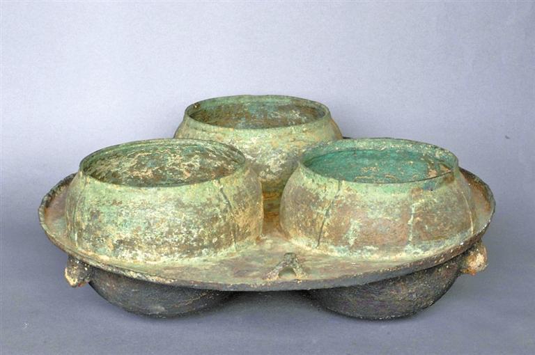 1979年,靈臺縣獨店鎮(zhèn)中慶村飲馬嘴漢墓出土了一件類似火鍋的連體三釜銅灶。通高16.4厘米,釜口徑分別為17厘米、17.4厘米、16.7厘米。三連釜,用九塊范鑄成。三釜均斂口,圓唇,球腹,圜底。圓盤窄沿,盤面近沿處分別置三個三角形掛鈕,盤下三釜外側(cè)各有一支釘,釜底有煙炱。從盤面間三系看,可供吊掛,盤陰三個支臺,可用于支撐,顯然有流動使用的功能。三個釜可同時烹煮不同食物,圓盤還可烘烤其他食品。老百姓俗稱三釜銅“火鍋”,但該銅灶是否為火鍋還需要進(jìn)一步考證。