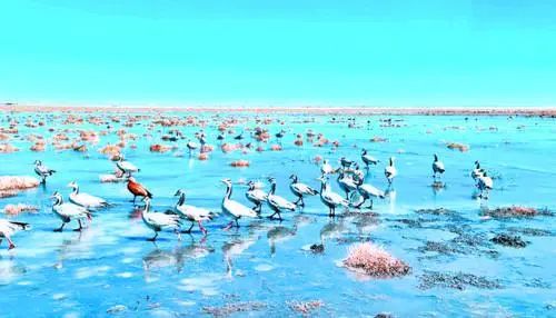 天氣晴朗時(shí),佇立湖邊的山崗上俯瞰湖心,好似一塊無(wú)瑕的翡翠。如果你來(lái)到這里,可飽覽遠(yuǎn)處草原的天空深邃如井,云如裙裾;近處的湖面上,鳥(niǎo)飛魚(yú)躍,這些美景定會(huì)讓你流連忘返。