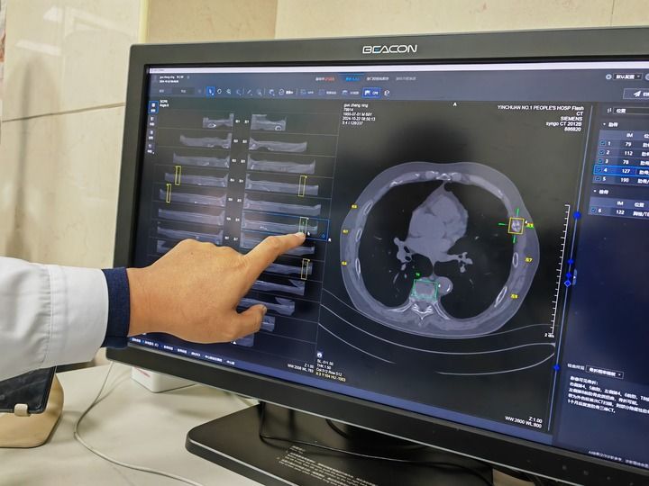在寧夏回族自治區(qū)銀川市第一人民醫(yī)院,放射科副主任醫(yī)師姜榮興打開電腦上的人工智能輔助診斷系統(tǒng),導(dǎo)入病患CT影像資料后,輕點鼠標,系統(tǒng)瞬間完成初篩——24根肋骨逐一呈現(xiàn)在屏幕上,骨折和疑似骨折的部位一目了然。醫(yī)生再對初篩結(jié)果作出診斷處理,全程用時不到4分鐘。