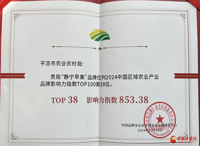 中國(guó)甘肅網(wǎng)12月25日訊(西北角·中國(guó)甘肅網(wǎng)記者 孫珩力 通訊員 胡繼萬)近日,由《中國(guó)品牌》雜志、中國(guó)品牌網(wǎng)主辦的2024區(qū)域農(nóng)業(yè)品牌年度盛典在浙江金華舉行。會(huì)上,“靜寧蘋果”品牌榮登2024中國(guó)區(qū)域農(nóng)業(yè)產(chǎn)業(yè)品牌影響力指數(shù)百強(qiáng)榜。