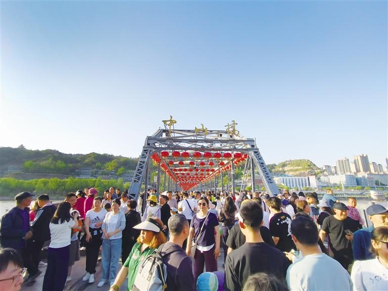 蘭州以火樣熱情和西北風(fēng)情吸引天南海北游客紛至沓來,人們在煙火氣和文化味之間尋找到這座城市的獨特魅力。圖為中山橋前游人如織。