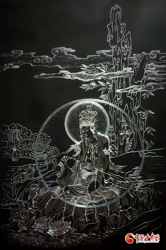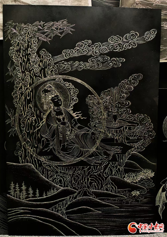 對張兆武來說,做鍥金畫從來不是“照貓畫虎”。他琢磨傳統(tǒng)書畫的筆墨、篆刻的力道,慢慢攢出了自己的一套刀法;創(chuàng)作時,心里裝的也全是敦煌——從莫高窟第112窟里“反彈琵琶”的靈動舞姿,到傳說中“九色神鹿”的溫潤模樣,都成了他刻刀下的主角。他刻出的飛天,飄帶像帶著風(fēng);刻出的菩薩,眉眼間透著莊重;金屬的光澤在畫面上流轉(zhuǎn),明明是靜態(tài)的畫,卻像在講一段活的敦煌故事。“不用多說什么,看過的人能懂這份美。”張兆武說的這份“懂”,恰恰打破了文化和語言的距離,讓東方的古老美學(xué),和全世界的現(xiàn)代審美碰出了共鳴。