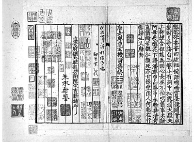 范景中先生曾見過謝蘭墀擺印本《唐宋文醇》,是書“正文用墨印,墨點(diǎn)用朱印,御評(píng)用黃印,朱子評(píng)用朱印,各家評(píng)用藍(lán)印,實(shí)為四色套印”。至于《唐宋詩(shī)醇》,范先生認(rèn)為是木活字五色套印。其主要依據(jù)是《詩(shī)醇》凡例云:“評(píng)語(yǔ)悉準(zhǔn)《唐宋文醇》之例,色別書之,但其中有援據(jù)正史雜說用資考訂疏解者,與古今人評(píng)詩(shī)之語(yǔ)義各有在,《文醇》未經(jīng)區(qū)別,今于藍(lán)筆之外,另作綠筆書,以便閱者,燦若列眉。”按照凡例的說法,《詩(shī)醇》在《文醇》朱、墨、黃、藍(lán)的基礎(chǔ)上又加了綠色,由此可知是五色套印本。實(shí)際上《唐宋詩(shī)醇》中并無(wú)康熙御評(píng),因此未用黃色。湖南省圖書館藏有一部謝蘭墀擺印本《唐宋詩(shī)醇》,八冊(cè),四十七卷全。我們委托張諾丕同學(xué)代檢全書,亦僅朱、墨、藍(lán)、綠四色而已,由此可知楊成凱先生所說四色套印本是正確的,而《增訂四庫(kù)簡(jiǎn)明目錄標(biāo)注》著錄的五色套印本恐不可信。