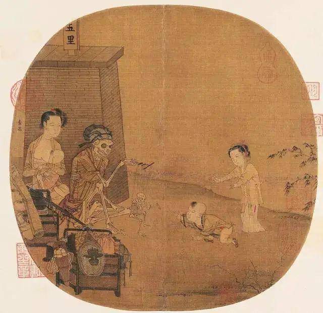 在這幅團扇大小的畫面中,李嵩描繪了一幅傀儡戲的演出場景,一幅披衣戴帽的大骷髏,操縱著線板,指揮著一幅小骷髏在表演各種動作。一個嬰兒好奇地爬向那個表演中的骷髏小傀儡……活人與骷髏、生與死,同時出現于畫面中,在中國古畫里是極罕有的,也因此引起了后世的種種猜測解讀。