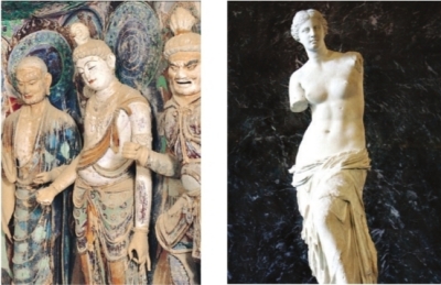 可是,“脅侍菩薩微笑著,在她低垂的眼中可能根本沒有勝負(fù)這回事。這種眼神是利他而非個(gè)人的……當(dāng)我們?cè)?5窟佛龕前微微俯下身子之時(shí),溫暖的奇跡出現(xiàn)了,她正慈祥地看著你。一位是由堅(jiān)硬的大理石所雕,另一位是由敦煌本地黏土所塑,維納斯和脅侍菩薩似乎代表了兩種生活態(tài)度。假如她們?cè)诒R浮宮中相遇,談?wù)撈鹈?。維納斯可能會(huì)唱起女詩人薩福的詩歌:‘你愛的就是美的。這容易解釋。’脅侍菩薩則依然保持微笑,靜靜地看著維納斯”。
