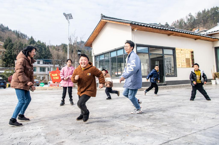 1月24日,在重慶市巫山縣騾坪鎮(zhèn)路口村數(shù)字農家書屋外,“臨時家長”和孩子們一起玩游戲。
