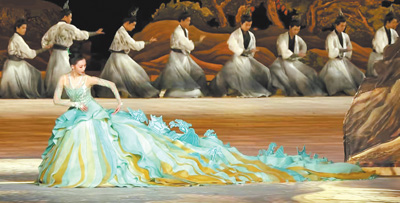 二〇二三年杭州亞運會開幕式“國風雅韻”篇服裝設(shè)計“水天碧”長裙,總設(shè)計師楚艷。