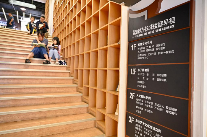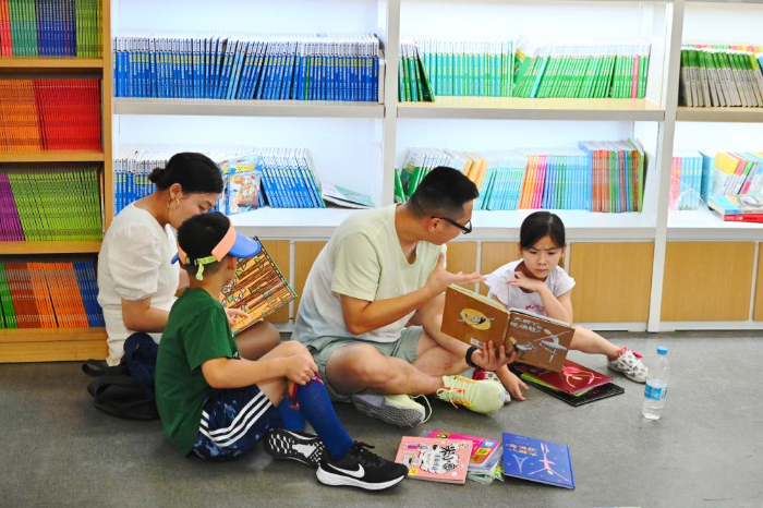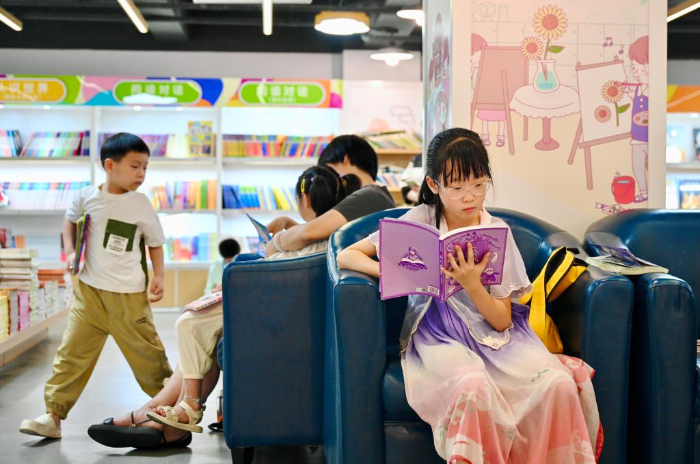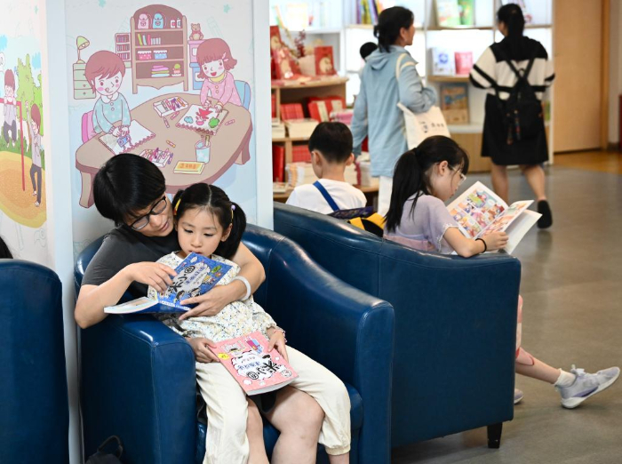 7月6日,福州新華書店鰲峰坊書城內(nèi)家長陪伴孩子讀書納涼。