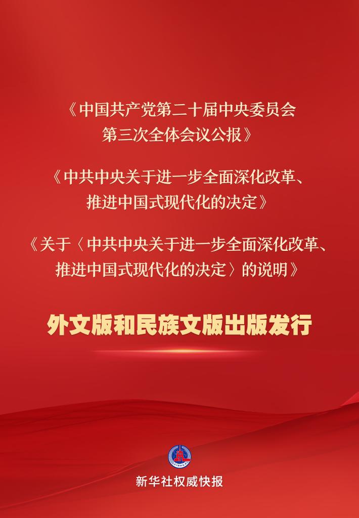 《中國(guó)共產(chǎn)黨第二十屆中央委員會(huì)第三次全體會(huì)議公報(bào)》《中共中央關(guān)于進(jìn)一步全面深化改革、推進(jìn)中國(guó)式現(xiàn)代化的決定》《關(guān)于<中共中央關(guān)于進(jìn)一步全面深化改革、推進(jìn)中國(guó)式現(xiàn)代化的決定>的說明》的英文、法文、西班牙文、日文、俄文、德文、阿拉伯文、葡萄牙文、越南文、老撾文等10種外文版已由中央編譯出版社、外文出版社出版,面向國(guó)內(nèi)外公開發(fā)行。