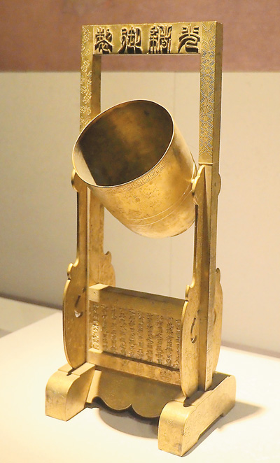 一件造型獨(dú)特的金色器物吸引了記者注意。達(dá)微佳介紹,這是故宮博物院藏清代銅鍍金欹器。欹器是一種傾斜易覆的盛水器,中空時(shí),會(huì)向一側(cè)傾斜;注水一半時(shí),能保持端正;水注滿時(shí),會(huì)傾覆倒出,生動(dòng)展現(xiàn)了儒家“不偏不倚,無(wú)過(guò)不及”的中庸之道。據(jù)文獻(xiàn)記載,孔子曾在魯桓公之廟觀欹器,并向?qū)W生講解它的道理。古時(shí)國(guó)君將欹器置于座右,作為修身之戒,因此又稱(chēng)“宥坐之器”。