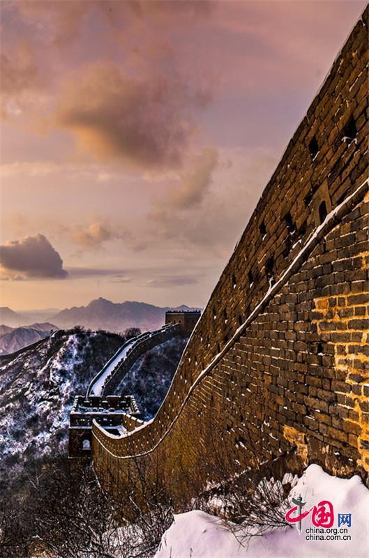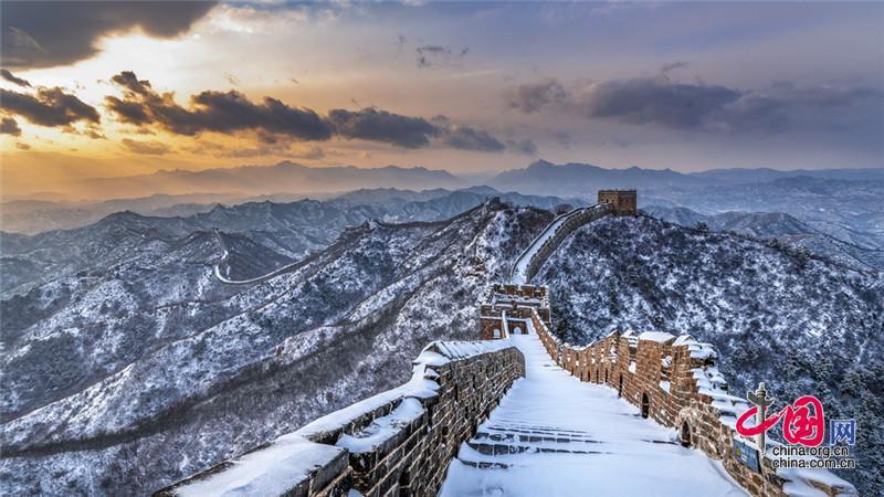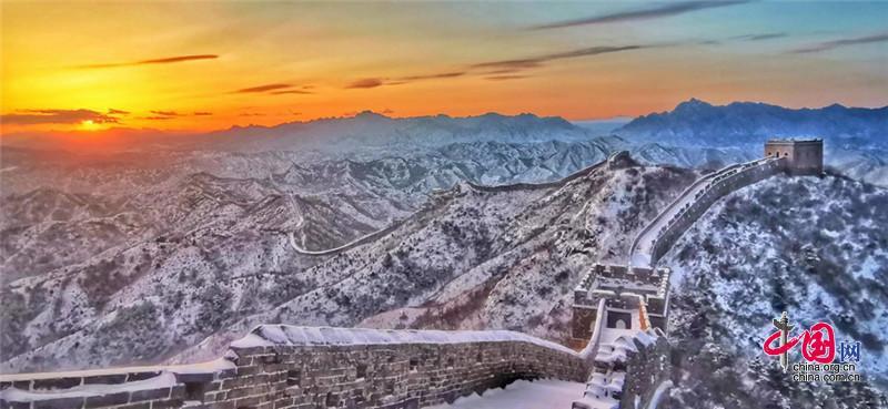 皚皚白雪覆蓋長城內外,銀裝素裹金山嶺氣勢磅礴。