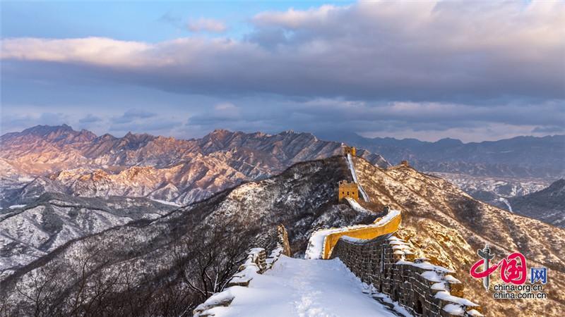 雪后,金色陽光映襯下,河北承德灤平縣的金山嶺長城巍峨壯觀,美如畫卷。