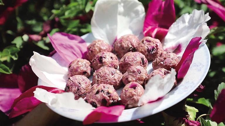 牡丹花肉丸,鮮香軟糯,做法不難。采摘新鮮的牡丹花,取花瓣用清水洗凈,選取肥瘦相間的羊肉剁成肉泥,和入切碎的牡丹花瓣,加入適量調(diào)料充分?jǐn)嚢枞嗄蟪赏枳?,裝盤(pán)入鍋蒸20分鐘左右即可。熱氣騰騰的牡丹花肉丸,花香伴著肉香,由不得人大快朵頤。