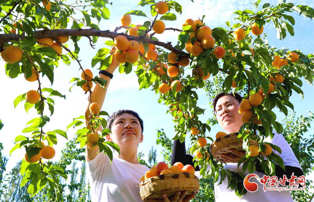 7月15日,甘肅省張掖市甘州區(qū)一專業(yè)合作社的特色林果種植基地內(nèi),金黃色的杏梅掛滿了枝頭,工作人員正在采摘成熟的杏梅。