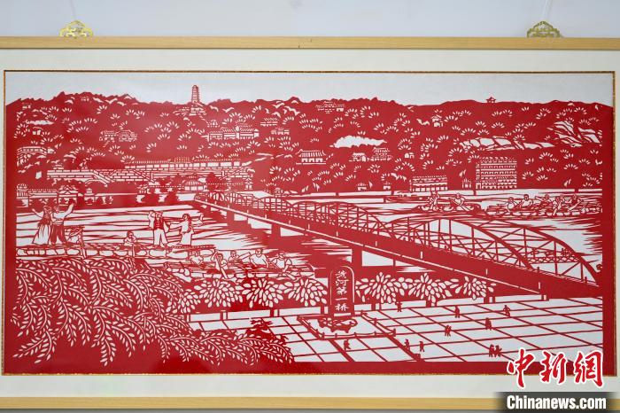 圖為展出以蘭州標志性建筑中山橋為主題的剪紙作品。中新社記者 九美旦增 攝