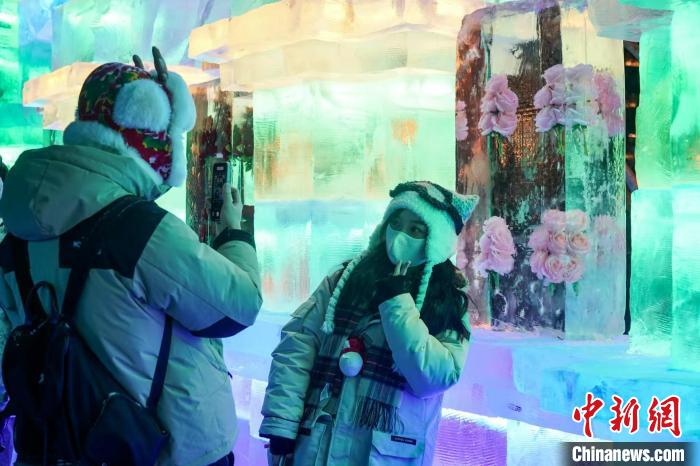 游客在哈爾濱冰燈藝術(shù)游園會打卡拍照 趙宇航 攝
