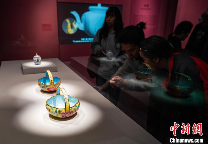 圖為故宮博物院藏“牡丹紋海棠式花籃”展品吸引觀眾參觀。中新網(wǎng)記者 侯宇 攝