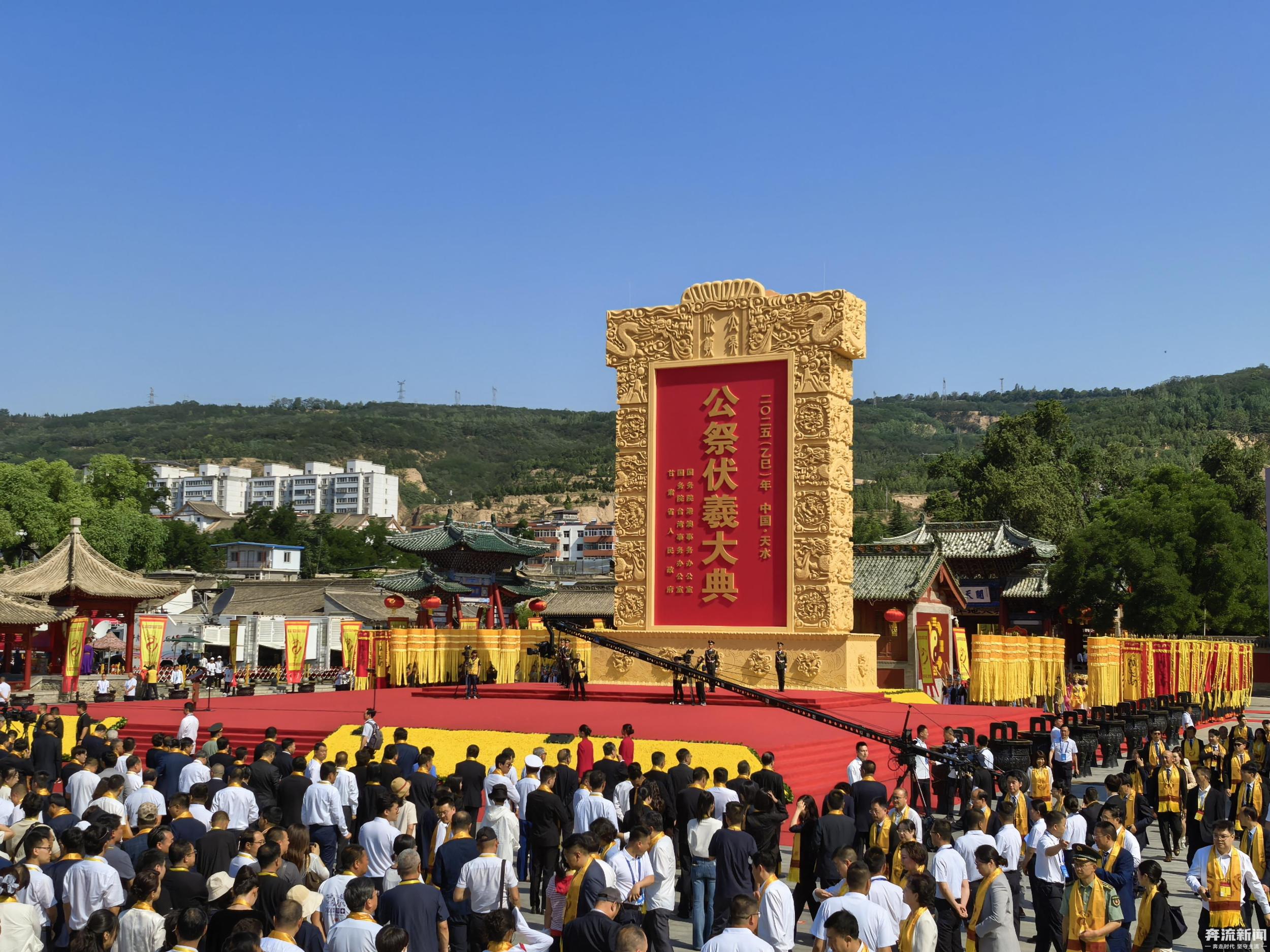 6月21日,夏至,甘肅天水,整座城沉浸在莊重而神圣的氛圍中。當日,2025(乙巳)年公祭中華人文始祖伏羲大典在天水伏羲廟盛大舉行。人們從四面八方匯聚于此,共赴這場跨越千年的文化之約,向人文始祖伏羲致以最崇高的敬意。與此同時,寶島臺灣也同步舉行海峽兩岸共祭中華人文始祖伏羲典禮。